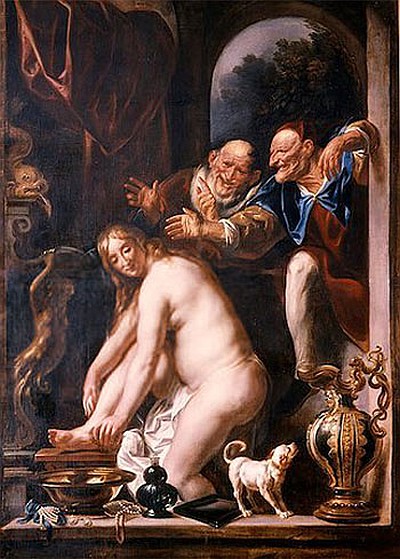 Jordaens paints at least three canvases with the subject of Susanna and the Elders. Susanna's story is that of a young "very beautiful, God-fearing," Joaquin rich wife, who two old men spy in the bathroom. They attempt to force her to have sex with them, saying that if she refuses, they will say she has been left alone, without her maids, to lay with a young man. Susanna does not yield to their threats. Then the old men accused her of adultery and obtain her death sentence. Intervenes then the prophet Daniel who, questioning the elderly, succeeds in proving the falsity of the accusation, which was saved Susanna and the elders were executed.