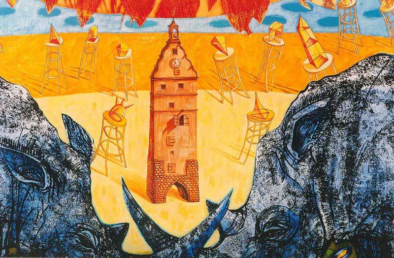 Katarzyna Kopańska is an artist who creates a broad, extremely general, multi-coloured outlook on the world out of elements taken from reality or even from her immediate surroundings. It is not easy to reconstruct the iconology of her pictures, but the first impression is that these works, with their complex and panoramic representations, derive from the medieval painting convention, that of the first centuries of the second millennium. This line of interpretation indicates the contact with ancient Greek mythology, inherited by the cultures of Rome and Byzantine. And that is the source of our Polish borderland culture, an intersection of varying influences, the assimilation of currents springing from a number of different foreign cultures.