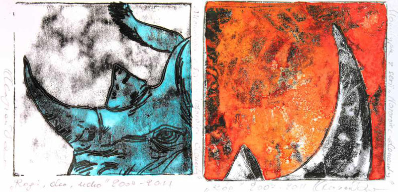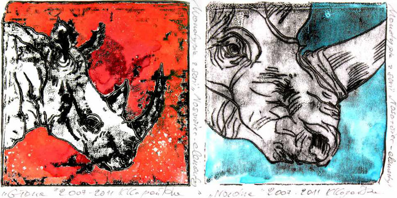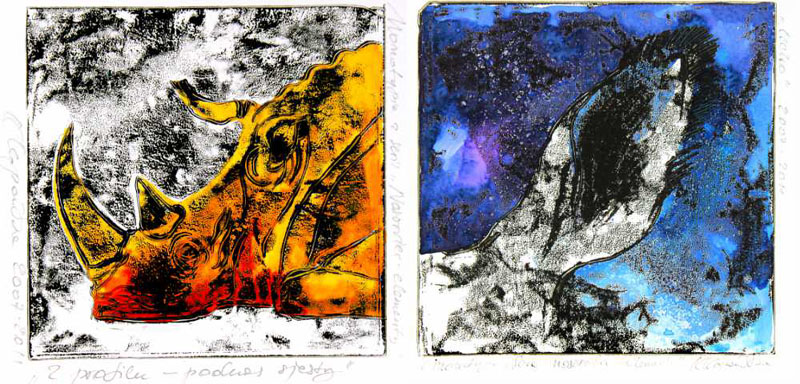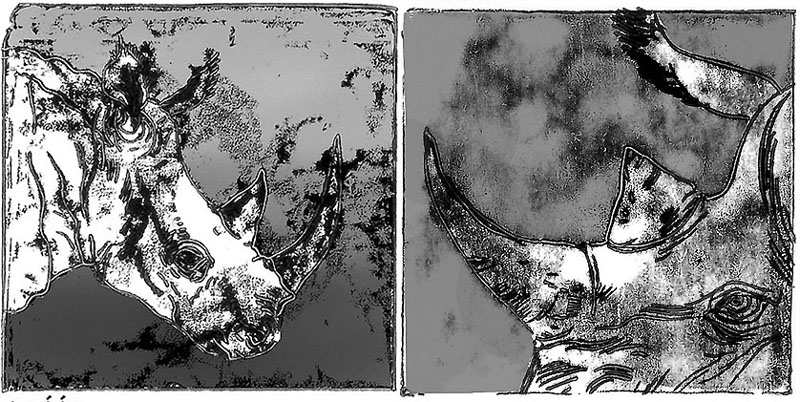 Izq./ Left: "Dwa nosorożce / Dos rinocerontes / Two Rhinos" - Der./ Right: "Czoło / Frente / Forehead"
