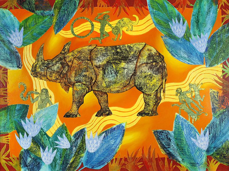 Katarzyna Kopańska is an interesting Polish artist in whose work abound rhinos; a curious iconographic incorporation into a pictorial universe that remember most ancient Mediterranean engravings with deities and Phoenician ships, now in full color. We'll see more of this artist in future posts.