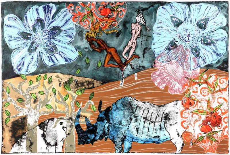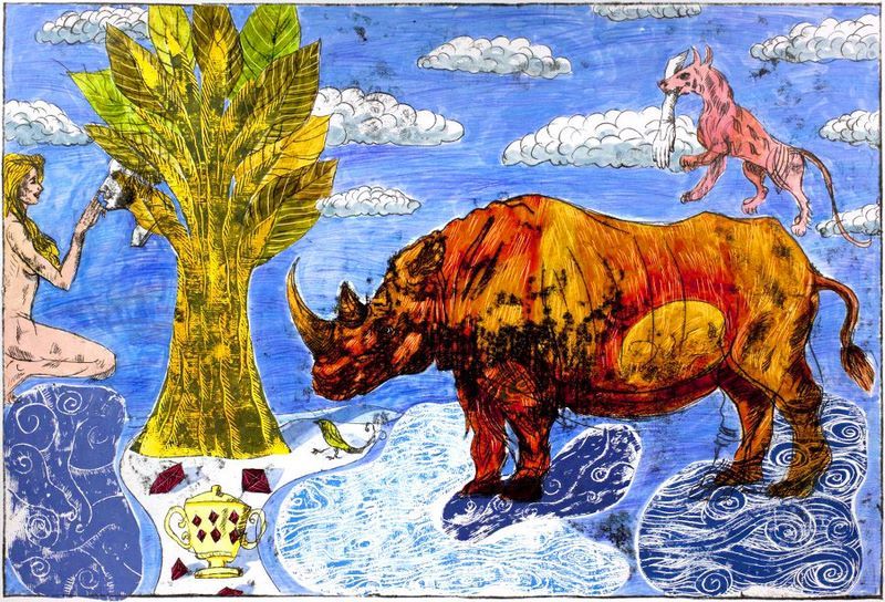 Katarzyna Kopańska es una interesante artista polaca en cuya obra abundan los rinocerontes, una singular incorporación iconográfica en un universo pictórico que más recuerda los antiguos grabados mediterráneos con deidades y barcos fenicios, ahora a todo color. Veremos más de esta artista en futuros posts.