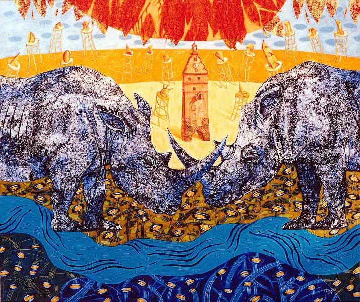 "Rinoceronte azul / Blue Rhino", óleo sobre lienzo / oil on canvas, 110 x 135 cm., 2002